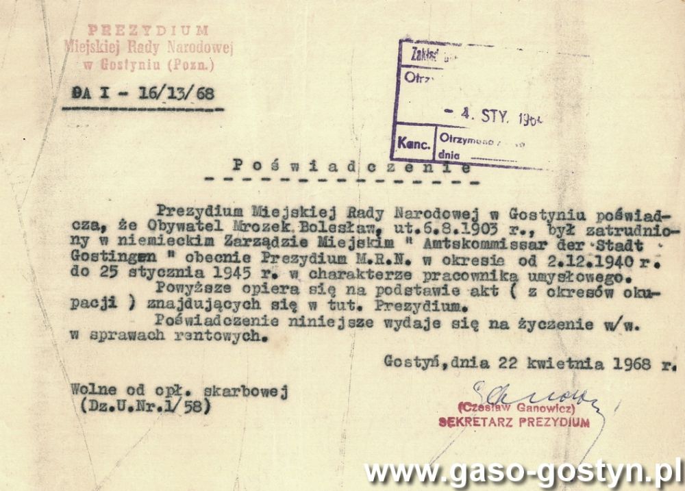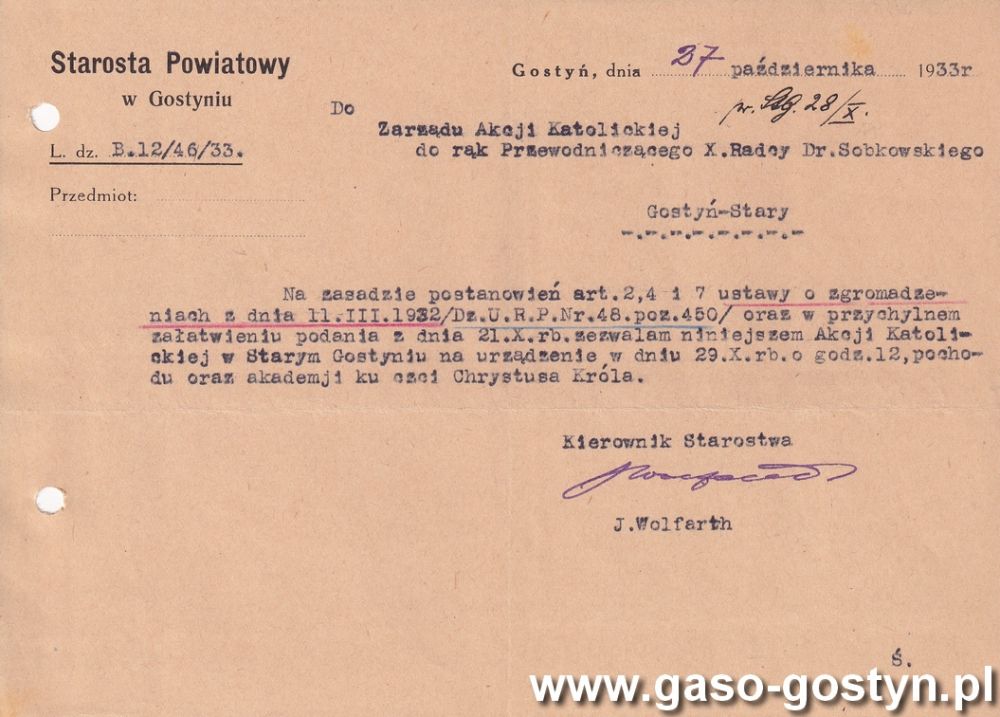 Ponadto do zakładki "dokumenty" dokładamy poświadczenie zatrudnienia w niemieckim Zarządzie Miejskim Amtskommissar der Stadt Gostingen i zezwolenie dla Akcji Katolickiej w Starym Gostyniu na urządzenie w dniu 29 października 1933 roku pochodu i akademii ku czci Chrystusa Króla.