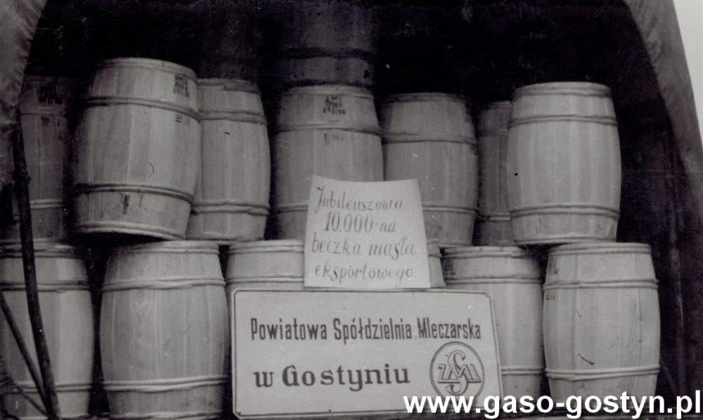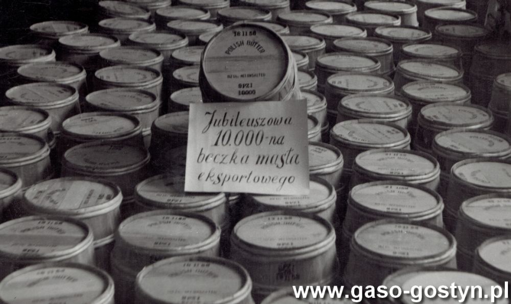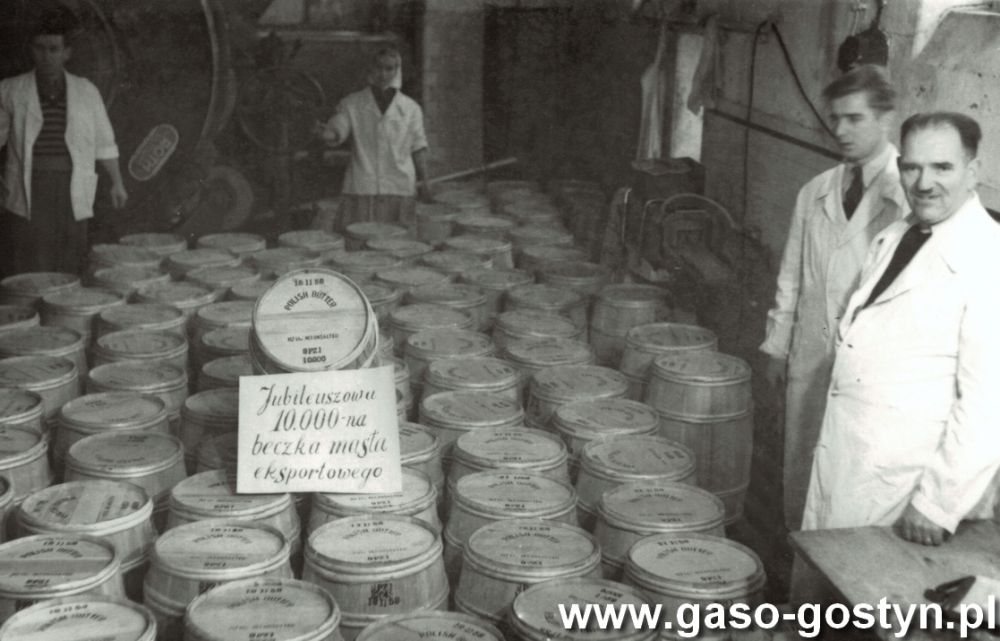 Zdjęcia z 1959 roku z Powiatowej Spółdzielni Mleczarskiej w Gostyniu - jubileuszową dziesięciotysięczną beczkę masła eksportowego prezentują Czesław Andrzejewski (zastępca prezesa i kierownik produkcji) i Czesław Bogdańskiki (kierownik laboratorium).